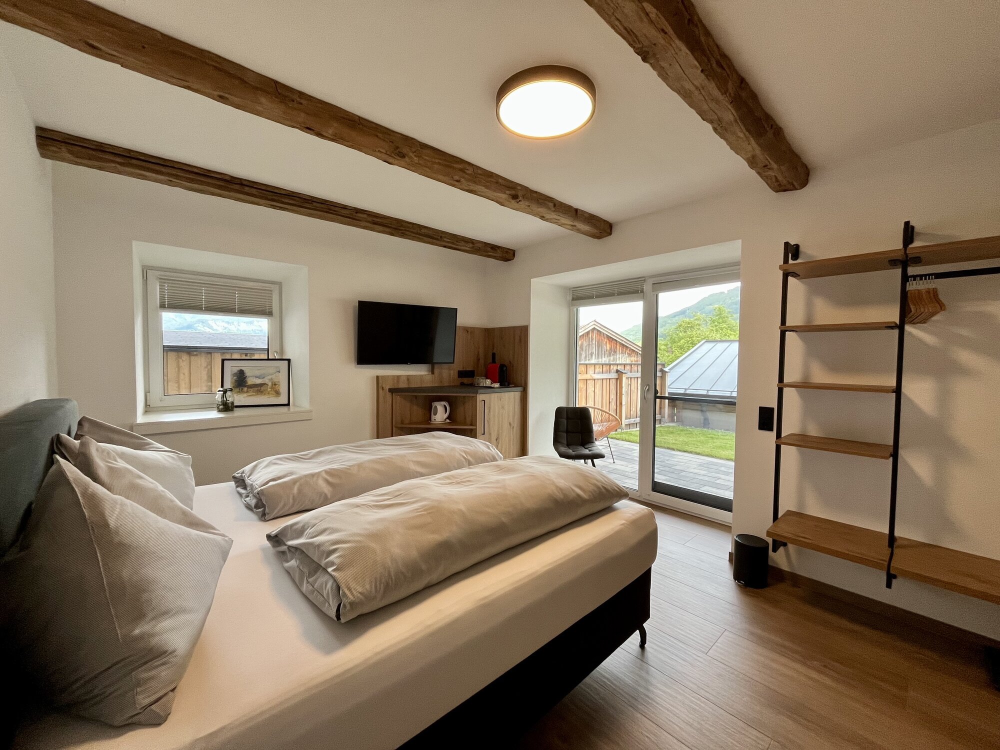 Unsere ruhig gelegenen Unterkünfte befinden sich in einem liebevoll kernsanierten Bauernhaus und bieten einen atemberaubenden Blick auf die umliegende Bergwelt.